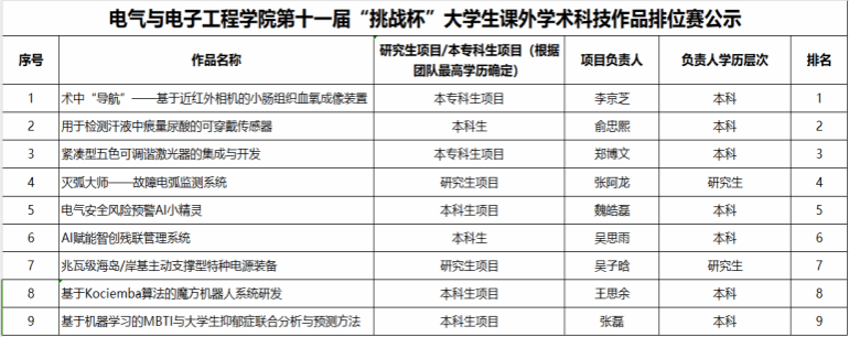 根据校发《关于组织开展蜜桃视频 第十一届“挑战杯”大学生课外学术科技作品竞赛和2025年度学生科研课题项目申报的通知》等相关文件要求,经团队申请、学院评比,现对蜜桃视频 本届“挑战杯”学生课外学术科技作品评审结果(排序)予以公示: