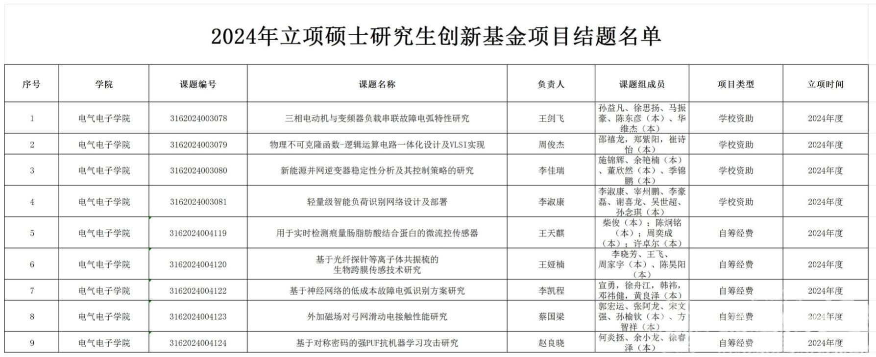 根据《蜜桃视频 硕士研究生创新基金管理办法(2020年修订)》要求,经项目负责人申报、学院研究生工作委员会评审,拟同意《三相电动机与变频器负载串联故障电弧特性研究》等九个项目结题。现将拟结题名单公示如下,公示期从即日起至3月2日,如果有问题,请联系林老师86689117。