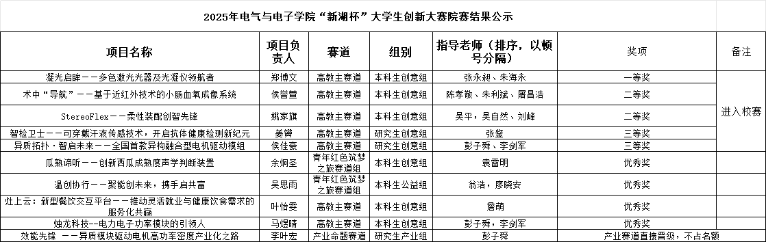 学院于2025年4月30日下午进行了“新湖杯”大学生创新大赛项目入围项目评比,经过同学们的答辩和评委提问环节,共遴选出5个项目参加学校比赛,其他获奖奖项如下所示,特公示三天(4月30日-5月3日),有异议请联系教务科张霞老师,86689020。