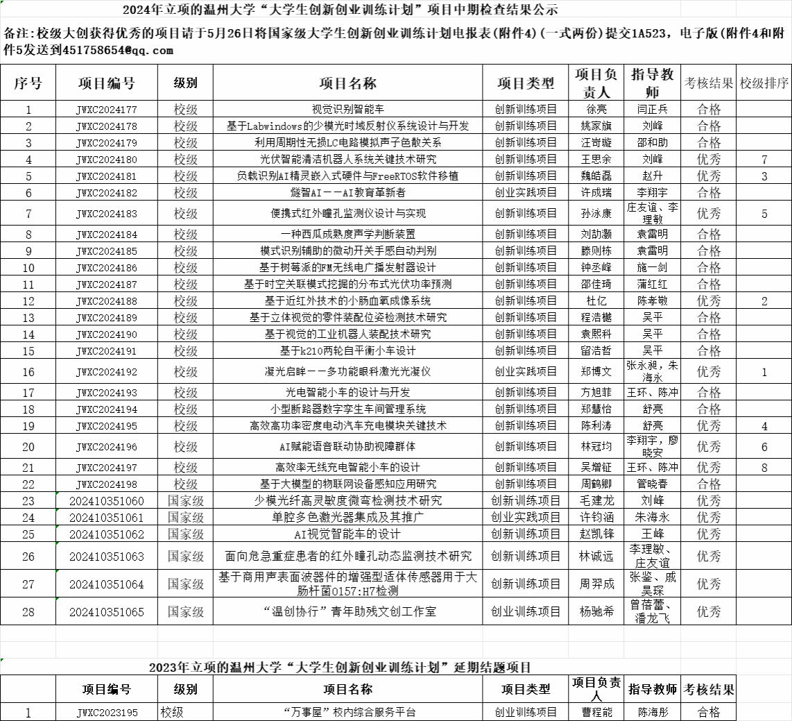 根据教务处的通知,蜜桃视频 组织了2024年立项的大学生创新创业训练计划项目中期检查及延期结题的审核,现将检查结果公示如下,公示期从即日起至5月27日,如果有问题,请联系张老师86689020。
