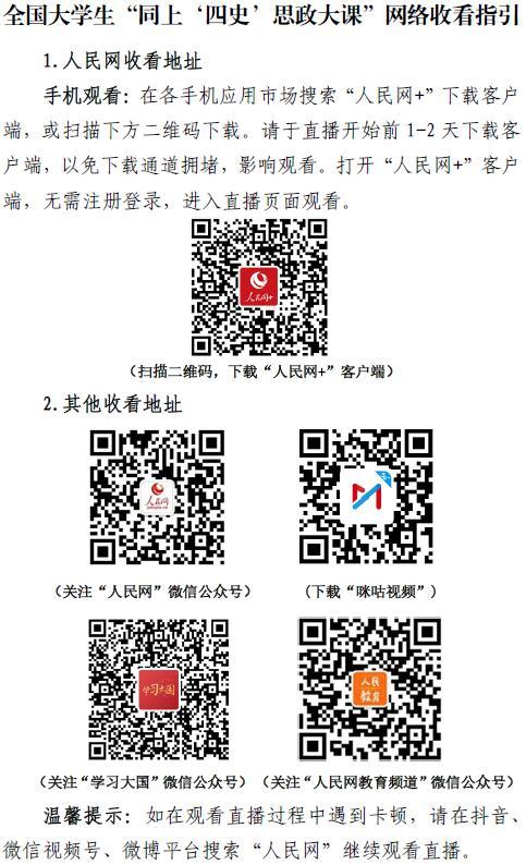近日,教育部社科司和省教育厅下发了《关于组织全国大学生“同上‘四史’思政大课”的通知》(详见附件)。请各学院按照通知要求,结合实际认真组织党史、新中国史、改革开放史、社会主义发展史四堂课的学习,相关师生请提前于课程开始前1-2天下载安装客户端(以免下载通道拥堵),根据课程时间安排集体收看,也可组织回看教学视频﹐操作方法详见附件通知中的“网络收看指引”。
