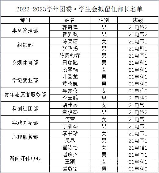 根据团委学生会干事自愿报名以及学院综合考虑,决定拟聘任以下同学为蜜桃视频 2022-2023学年团委学生会部长: