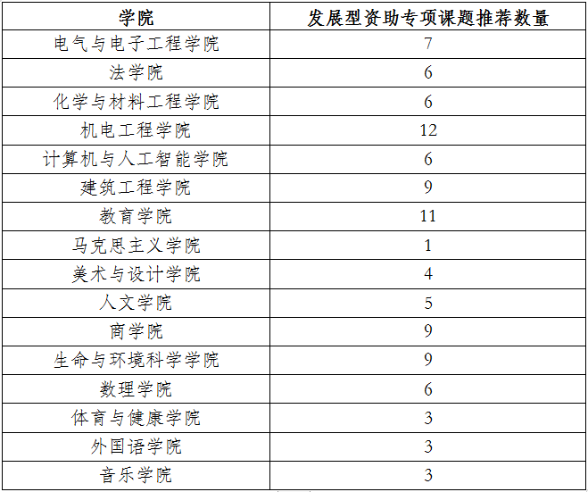 发展型资助专项课题采用学院推荐制,学院报送即可立项,2024年3月结题验收。各学院推荐件数如下表所示: