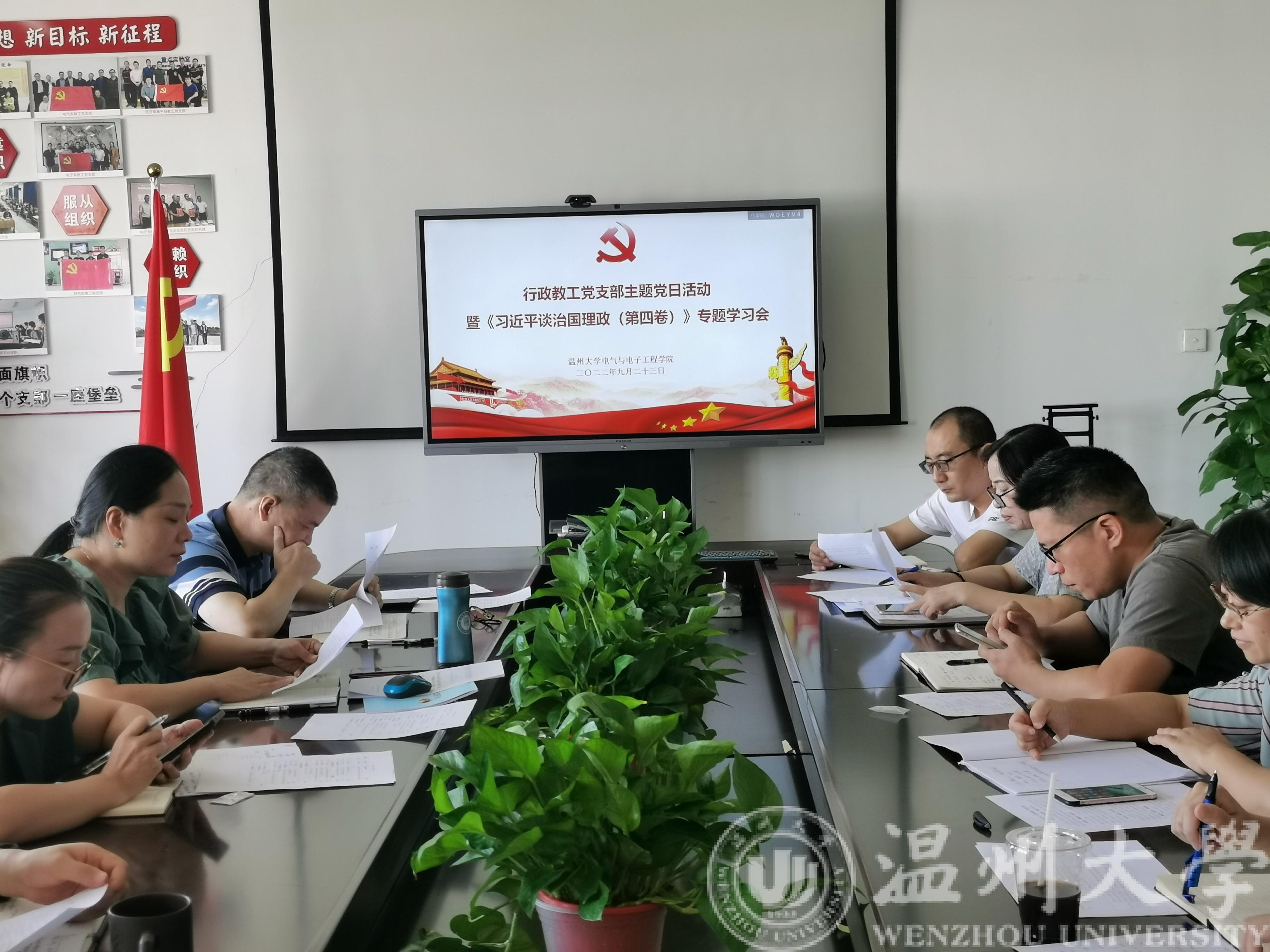 9月23日上午,蜜桃视频 行政教工党支部在院党务活动室召开主题党日活动暨《习近平谈治国理政》第四卷专题学习会,行政教工党支部全体党员参加了此次会议。会议由行政教工党支部书记曾蓓蕾主持。
