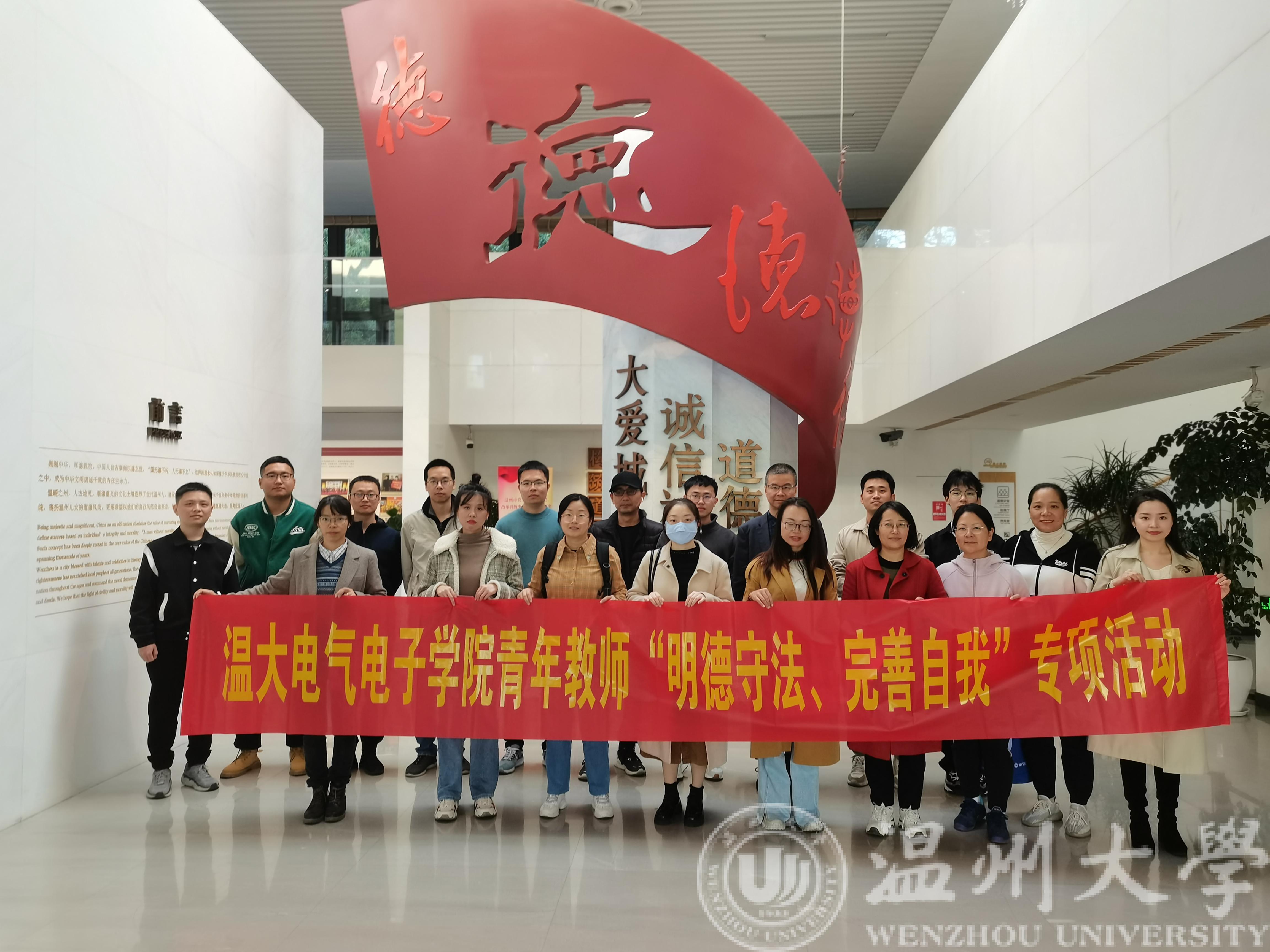 为深入学习贯彻习近平新时代中国特色社会主义思想和习近平总书记关于加强年轻干部教育管理监督重要指示精神,11月22日下午,蜜桃视频 组织20余名青年教师赴温州道德馆开展“明德守法、完善自我”主题教育专项活动,引导青年教师坚定理想信念、涵养道德操守、严守纪法规矩。
