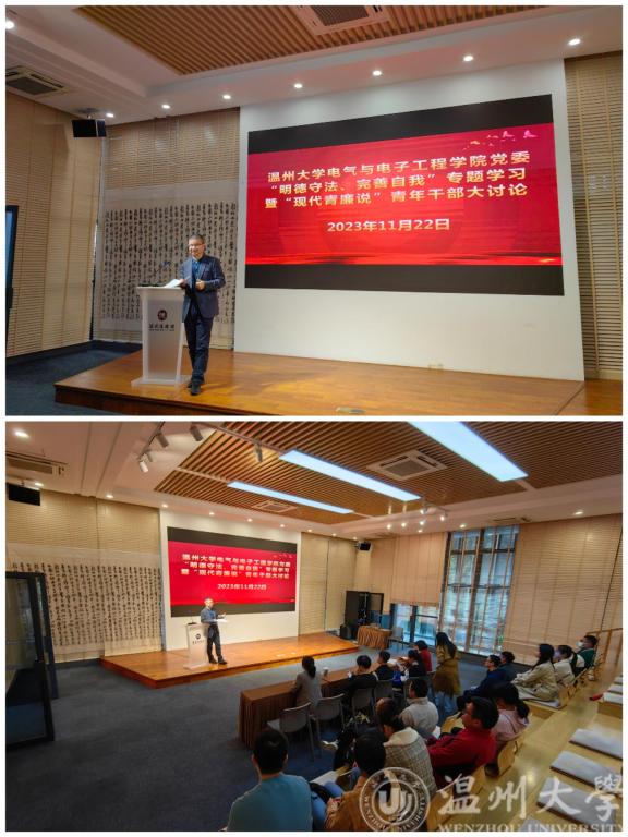 随后,学院党委书记李方强向参会青年教师传达了省、市主题教育办关于“明德守法、完善自我”专项行动工作方案精神,带领大家深入学习了《关于在主题教育中开展青年干部“明德守法、完善自我”专项行动的实施方案》 (浙教办发 [2023] 38 号)等文件精神,并组织青年教师深入学习习近平总书记关于政治品德、职业道德、社会公德、家庭美德等方面的重要论述。他要求全体青年干部要将“明德守法、完善自我”的要求落实在实际工作、日常生活中,要持续加强理论学习,坚守育人初心,不断提高政治站位,树立正确的法治观和道德观,增强廉洁自律意识,提升履职能力本领,以榜样的精神起好标杆作用。