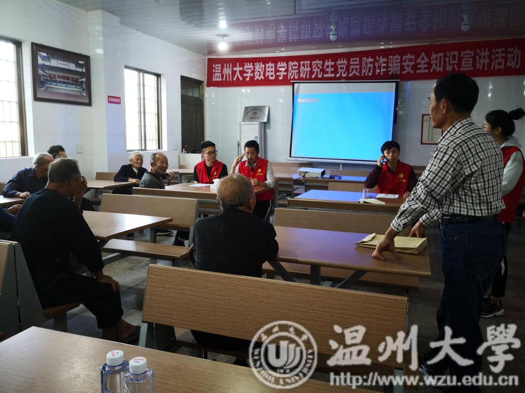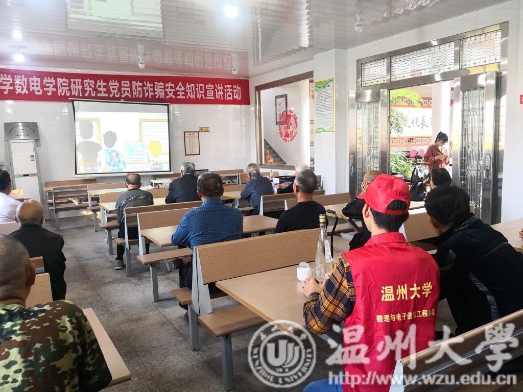 11月7日,蜜桃视频 数理与电子信息工程学院研究生党员借新青年下乡的契机,走进乐清翁垟街道开展党日活动,聆听了翁垟街道离退休干部支部书记题为“学习党的历史,传承红色基因”的党课,并为离退休支部老党员和当地群众做了防诈骗安全知识宣传。