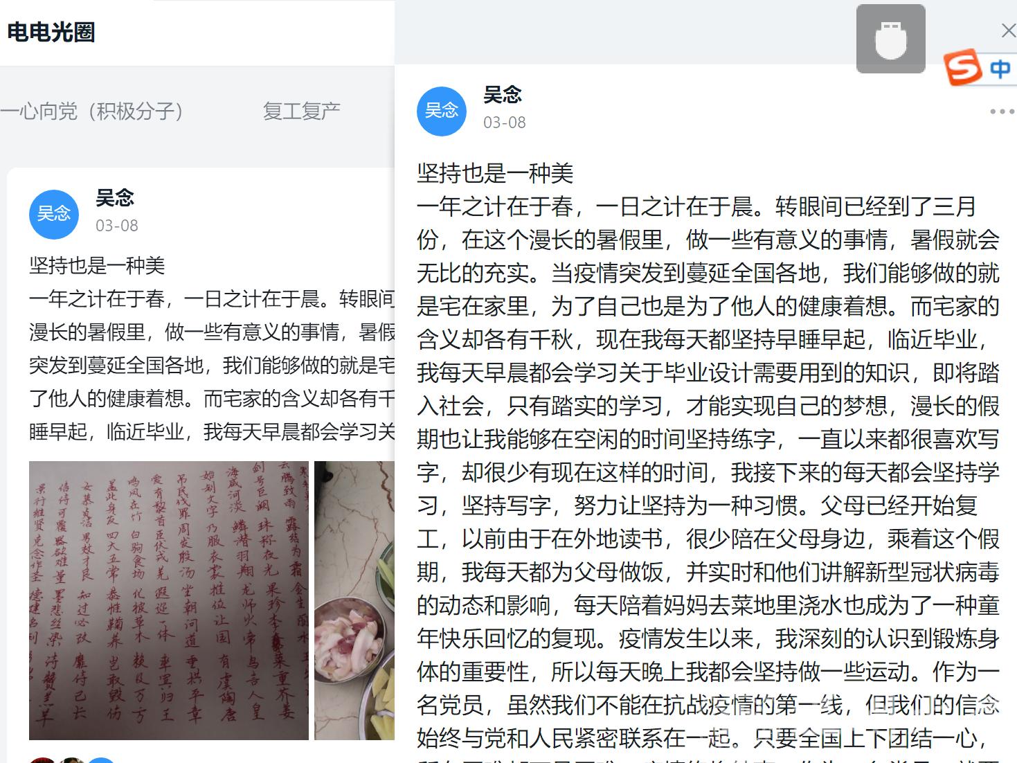 受新冠肺炎疫情影响,高校开展线上教学,大学生们在家上网课已成为一种常态,为深入贯彻中央和省市委关于统筹推进疫情防控和经 济社会发展工作的系列决策部署,加强疫情期间学生党员教育管理,蜜桃视频 开展党日活动,要求学生党员自主发布党员日记记录自己居家学习生活。学生党员们有的分享自己在家孝敬父母的小事,有的记录自己有条不紊的学习计划,有的分享自己参加社区志愿服务的经历,有的介绍自己助力复工复产的实习生活,有的表达自己对党和国家的信心......