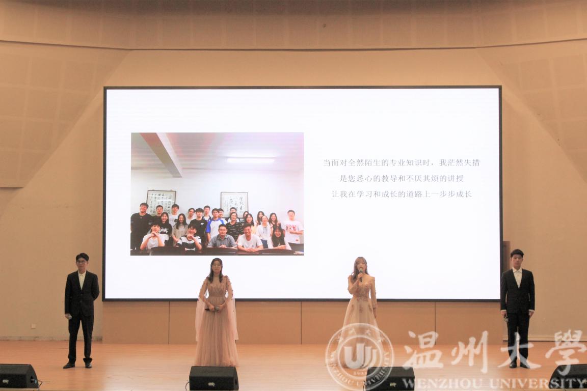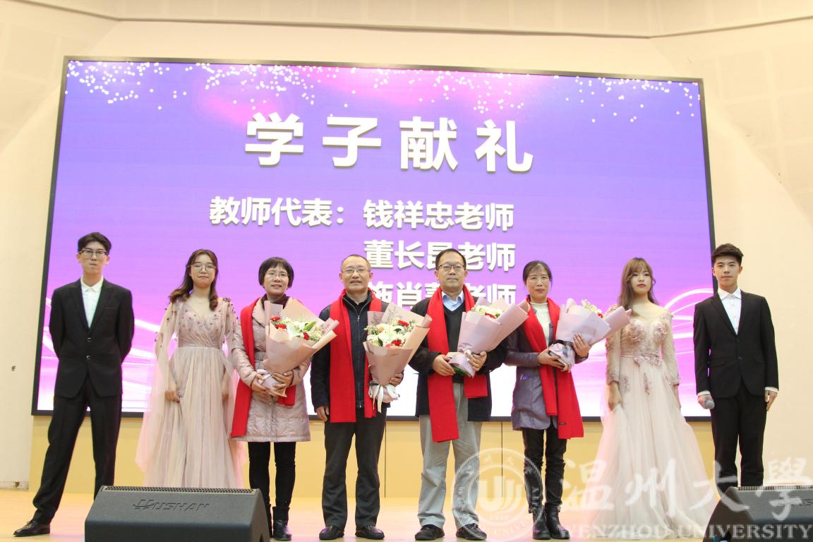 第四环节为风采展示。首先,由参加今年“挑战杯”大学生课外学术竞赛国家特别一等奖获奖的陈思梦同学,围绕着自身的学习和生活,以及参加“挑战杯”省赛、国赛的经历向与会师生做了分享;第二位是获得电子设计竞赛国家一等奖获得团队的张欣达同学,结合自己的竞赛经历和做实验的细节、感悟做了分享和总结;最后是获得优良学分班18电科2班的代表王贺瑶同学分享,她从班集活动和班级建设出发,向大家展示了一个优良班级体的形成。最后,由任奕沛、潘鹏宇、何铃钰、鲁祝承带来的诗朗诵《天南海北师生情》,他们用真诚的诗句向老师们表达着感恩之心和深深的祝福,并邀请教师代表上台,向老师们献上美丽的鲜花和红围巾,典礼在温馨、浪漫的氛围里落下帷幕。