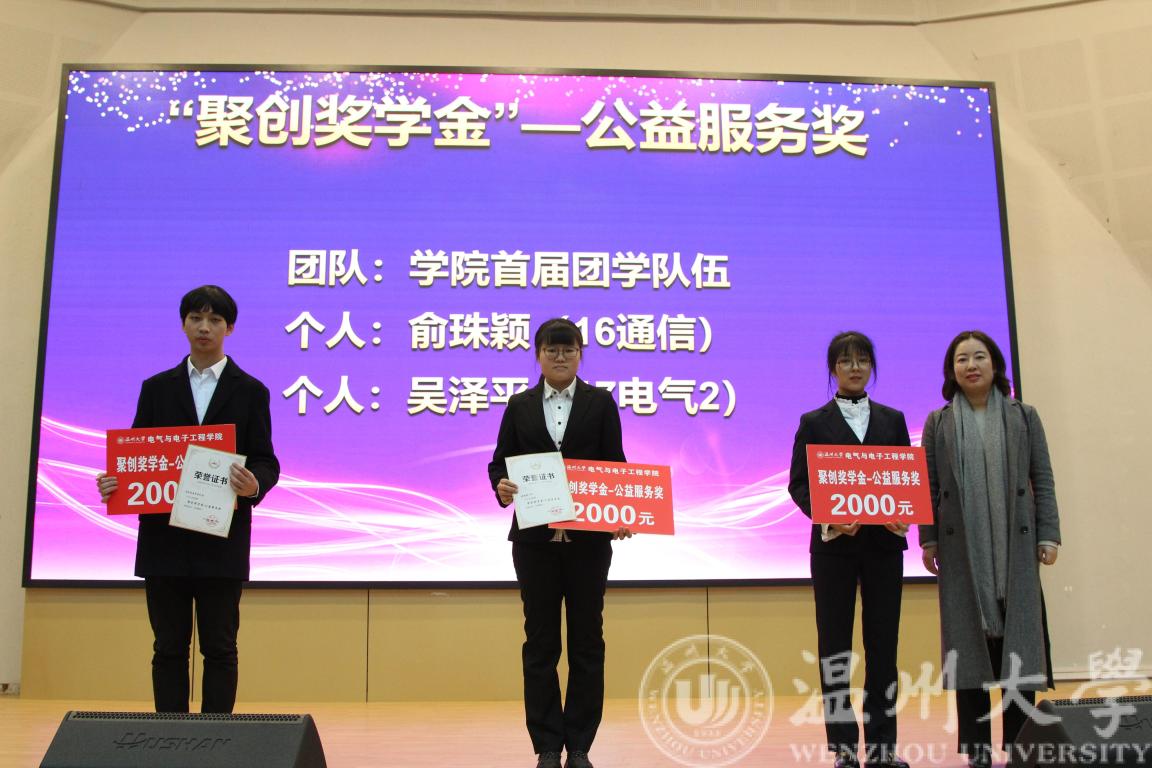 由蜜桃视频 十佳歌手唐凯、张天成带来的歌曲《等我回家》把典礼推入到第二环节:“聚创奖学金”捐赠、颁奖仪式。在“聚创奖学金”捐赠仪式上,由公司代表陈小益先生上台将“三十万整捐赠支票”,递交给李方强书记,两人在台上热情握手,现场掌声不断,把本次颁奖典礼推向最高潮。之后,浙江聚创智能科技有限公司董事长吴桂初先生致辞,他首先感谢蜜桃视频 一直以来对公司发展的关注与支持,也感谢蜜桃视频 给予合作的平台,他也衷心的祝愿蜜桃视频 能够桃李满天下。本次“聚创奖学金”共分设三个奖项,即科研创新奖、升学奖、公益服务奖。2019年度的升学奖将在2020年颁奖典礼上发放,本次颁奖盛典主要颁发科研创新奖和公益服务奖,由聚创公司代表为蜜桃视频 优秀团体及个人颁奖。