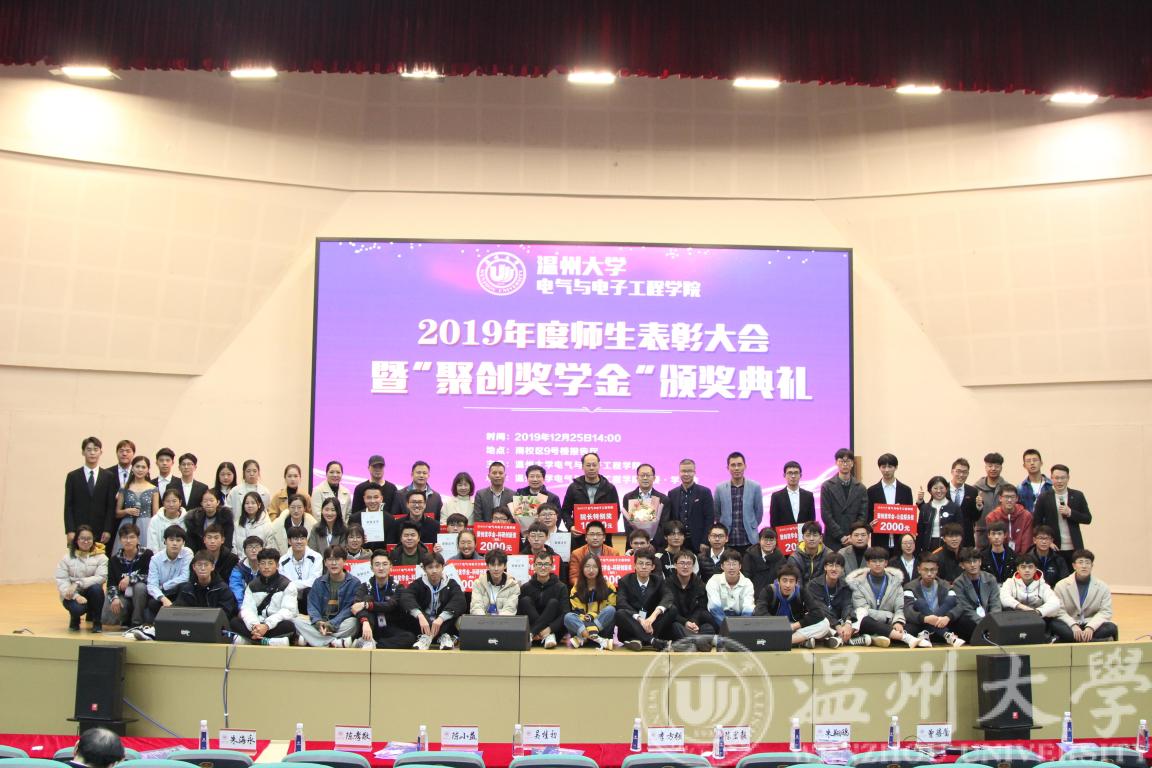 25日下午,由蜜桃视频 举办的2019年度师生表彰大会暨“聚创奖学金”颁奖典礼在蜜桃视频 南校区九号楼隆重举行。参加本次典礼的有浙江聚创智能科技有限公司董事长吴桂初先生、副总经理陈小益先生,蜜桃视频 校友办主任陈宏毅,电气与电子工程学院党委书记、副院长李方强及领导班子、学院全体教师,以及该院19、18、17级学生参加了此次盛典。